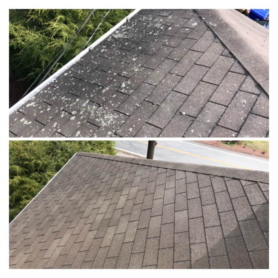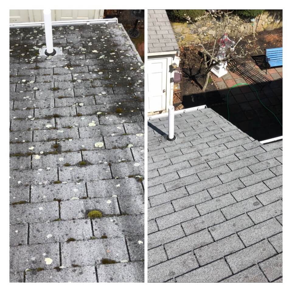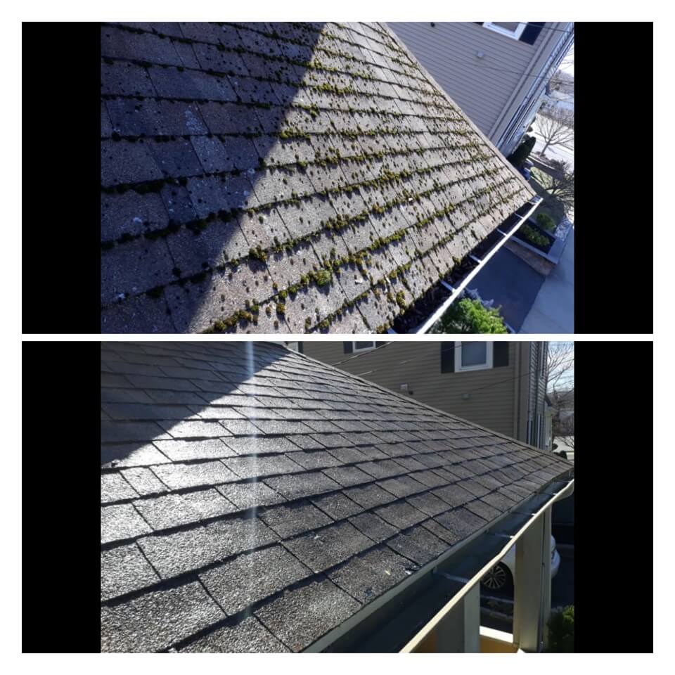 HiCleaners is the most experienced company in Dedham, MA that deals with roof washing and roof soft washing. All of our employees are trained to recognize precise solution mixing ratios to provide you with the safest and most effective soft washing service. Roofs are a commonly neglected part of a house due to the fact that most people don’t have ladders to access it, so it is very easy to just leave it alone and forget about problems that may start to arise. Just like many home owners, discoloration and small bits of moss on a roof can be overlooked because of the misconception that it is just aesthetic. However, it isn’t just aesthetic, the moss slowly lifts the granules off the shingles which in turn shorten the life of the shingle. The moss also spreads, just like any bacteria if it is left alone for too long, it can quickly become a problem that spirals out of control. Call HiCleaners for a free quote, we only use the most advanced eco-friendly solutions and equipment to make sure the job is done right, for the safety of the employees, your plants, grass, pets, and children.